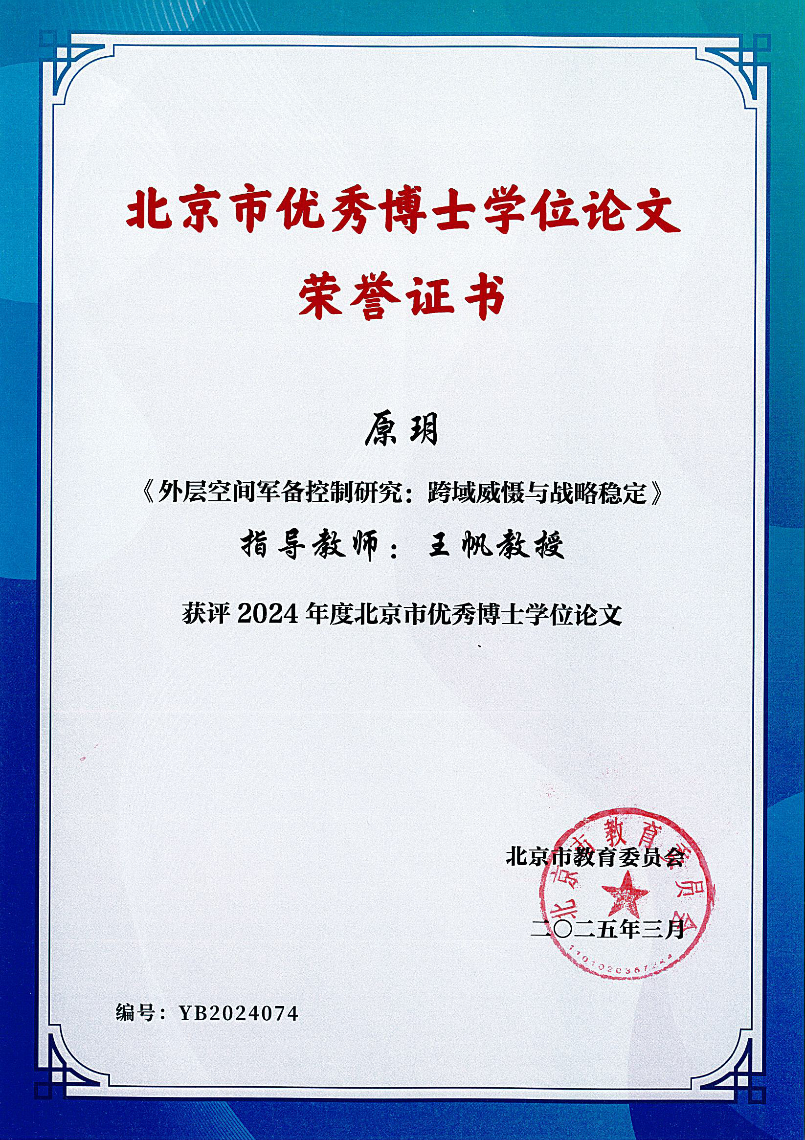 根据北京市教育委员会、北京市学位委员会公布的2024年度北京市优秀博士学位论文名单,我院国际关系专业博士毕业生原玥的学位论文《外层空间军备控制研究:跨域威慑与战略稳定》获评2024年度北京市优秀博士学位论文,指导教师为王帆教授。